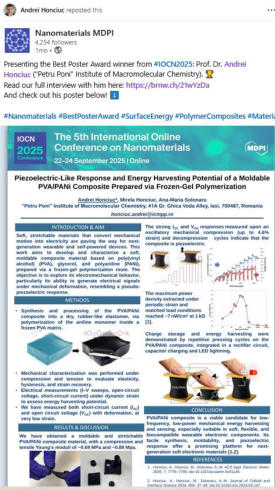 Dr. Andrei Honciuc, Dr. Mirela Honciuc and Dr. Ana-Maria Solonaru have won the The Best Poster Award for “Piezoelectric-Like Response and Energy